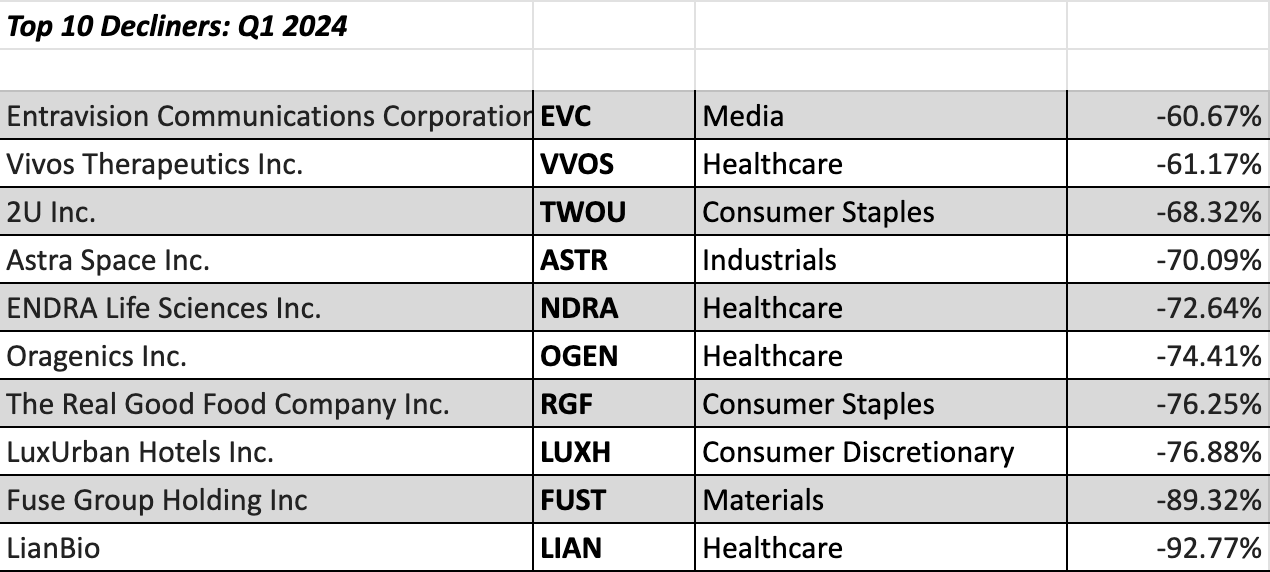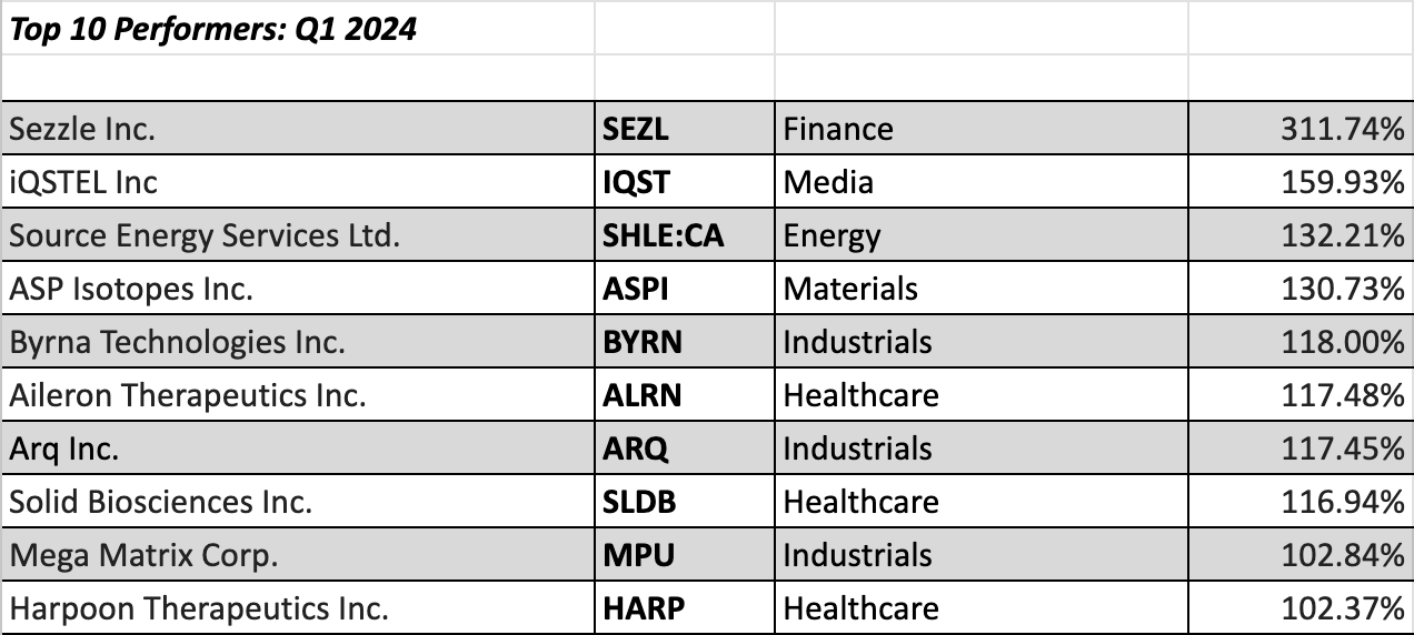 Planet MicroCap Index (MCRI™) Q1 2024 Performance, Sector Performance for Q1 2024 and Top 10 Performers/Decliners for Q1 2024