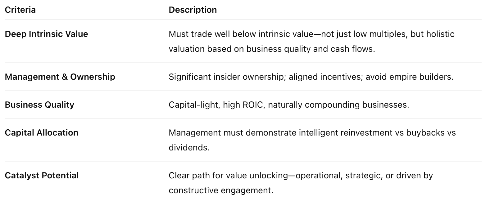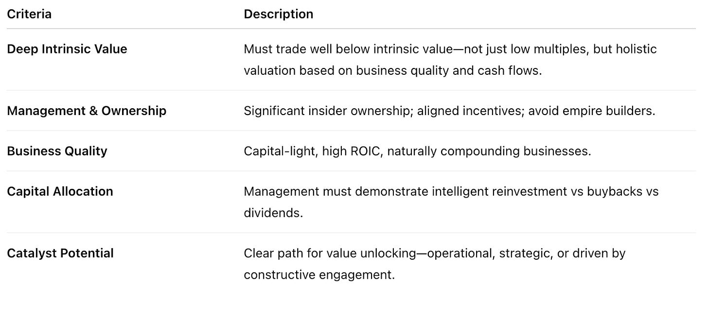 The strategy is rooted in thinking like a private owner of a public company, seeking long-term compounders trading at meaningful discounts to intrinsic value. Key criteria include: